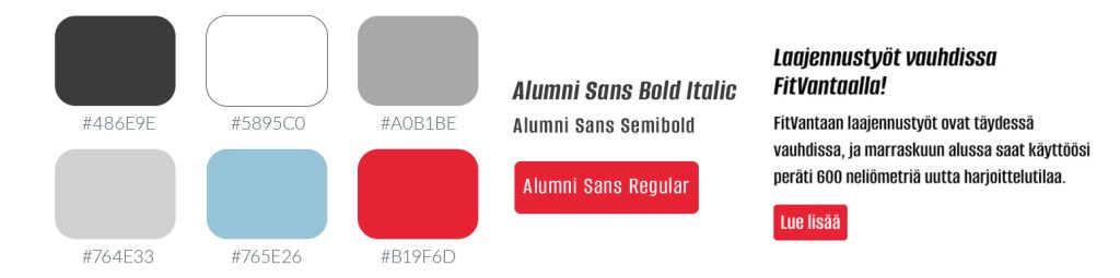 Suunnittelin kaksi toisistaan erottuvaa, mutta yhteensopivaa logoa osana brändiuudistusta. Toinen FitVantaalle ja toinen Iron Paradiselle. Lisäksi brändit tarvitsivat yhteisen värimaailman ja keskenään yhteensopivat graafiset ohjeistukset.